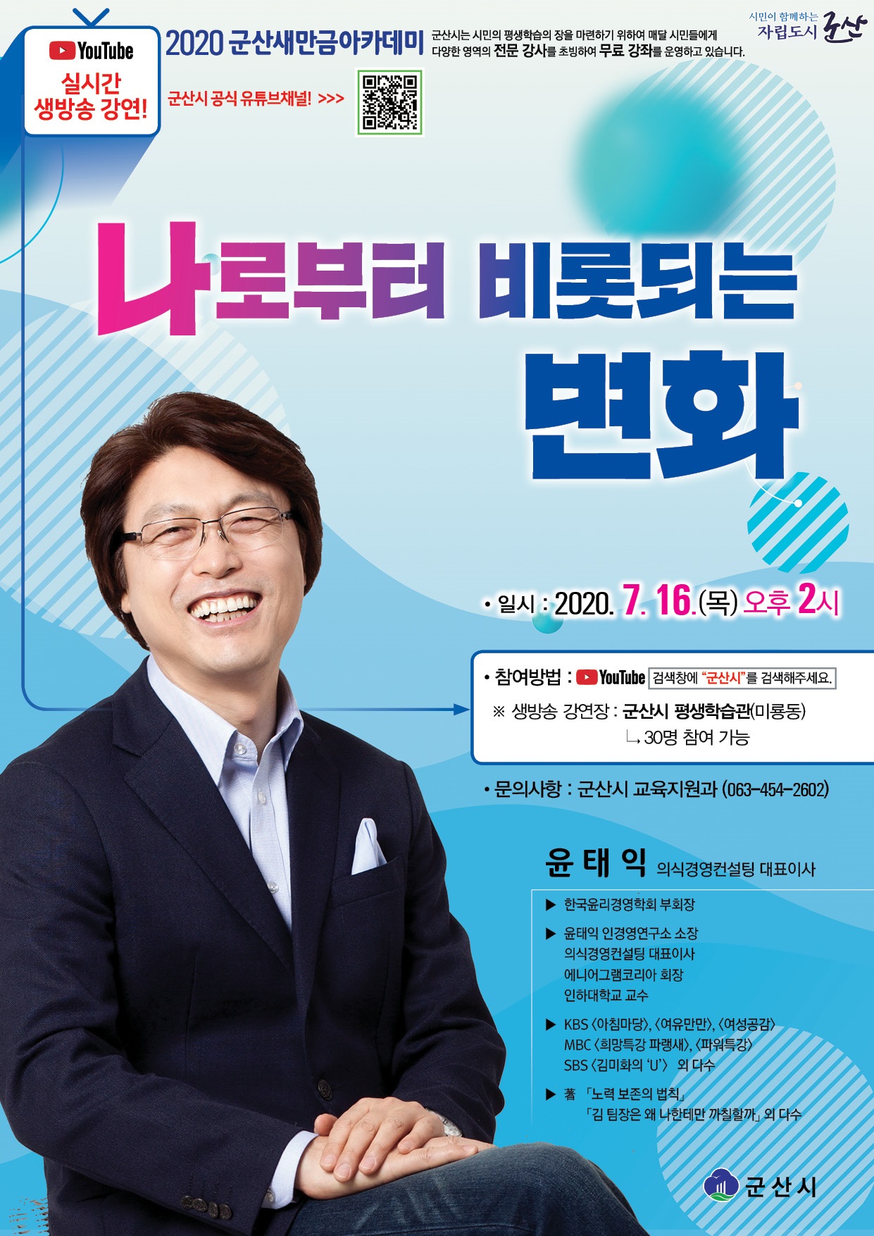 | 5316 | 군산새만금아카데미 온라인 생방송 강연 안내(7월 초청강사: 윤태익 의식경영컨설팅 대표이사) |