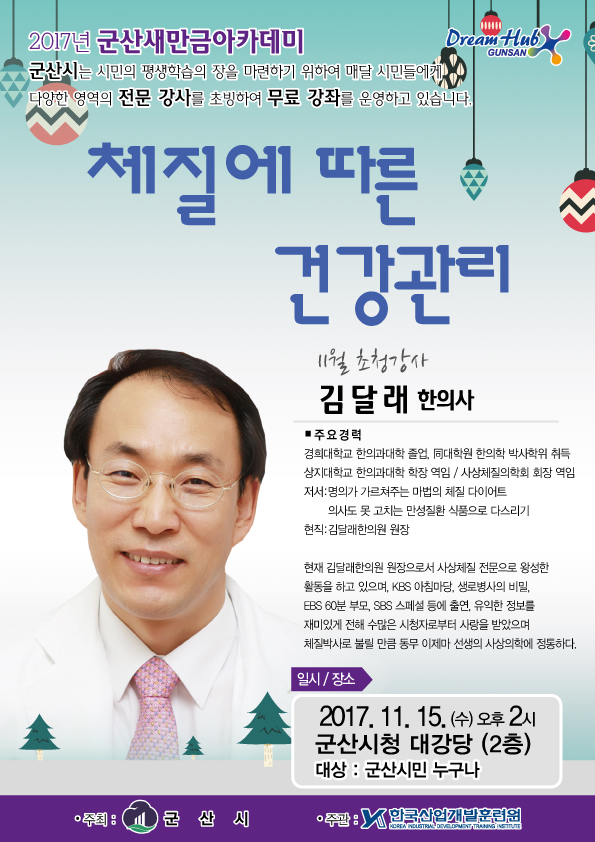 | 4119 | 군산새만금아카데미 김달래 한의사 초청〈체질에 따른 건강 관리〉무료강좌 참석 안내 |