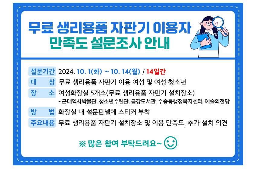 | 6062 | 무료 생리용품 자판기 이용자 만족도 설문조사 안내 |