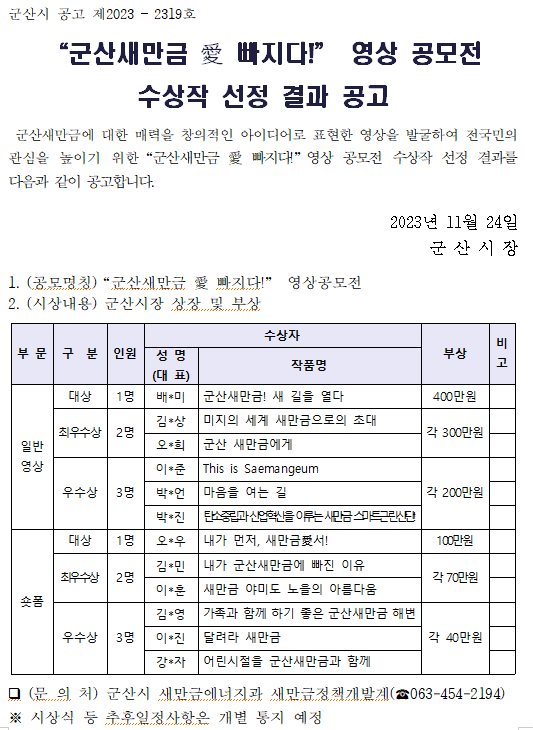 | 5922 | "군산새만금 愛 빠지다!" 영상공모전 수상작 선정결과 공고 |