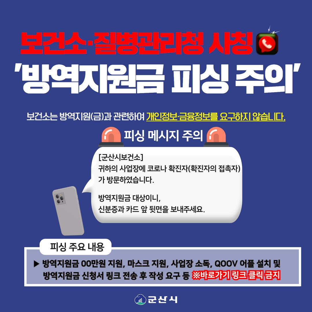 | 5734 | 보건소, 질병관리청 직원 사칭 ‘방역지원금 피싱’ 주의 |