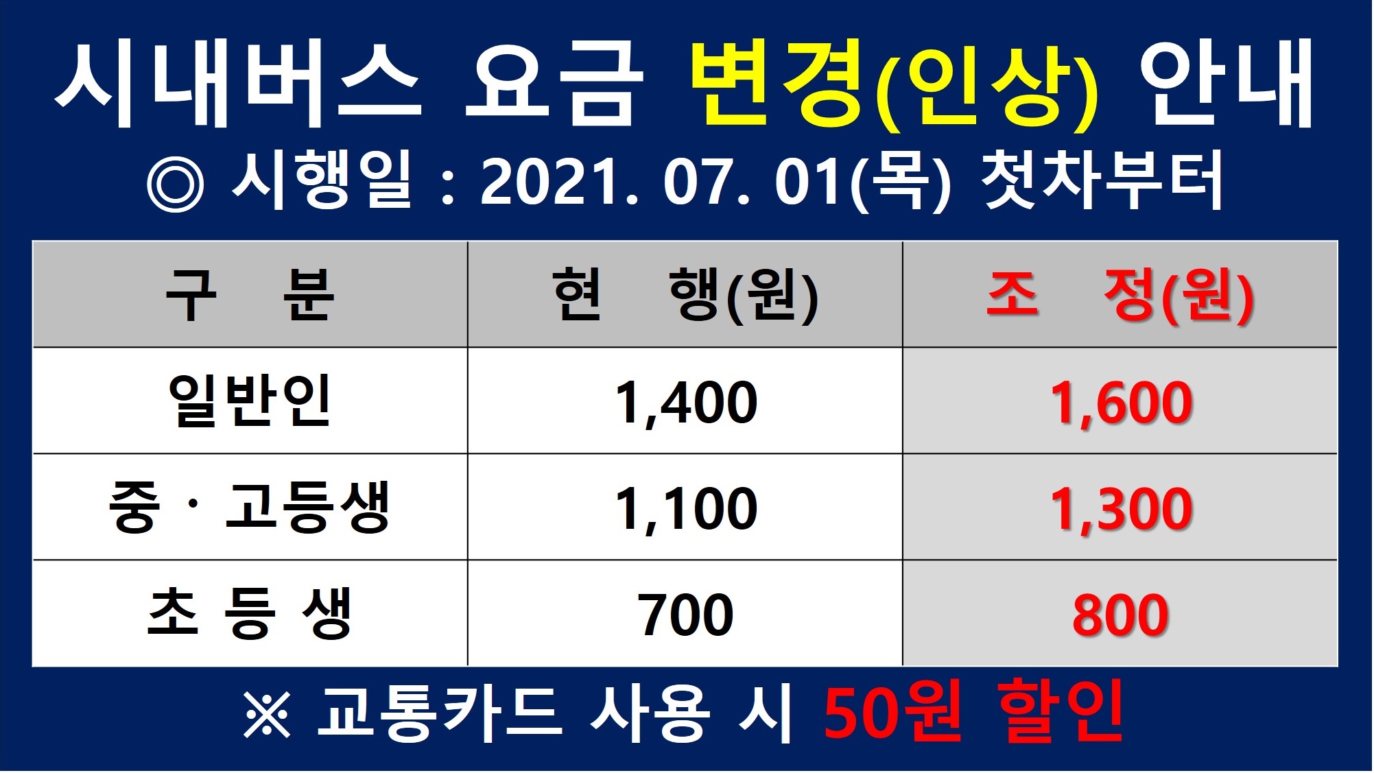 시내버스 요금 변경(인상) 안내