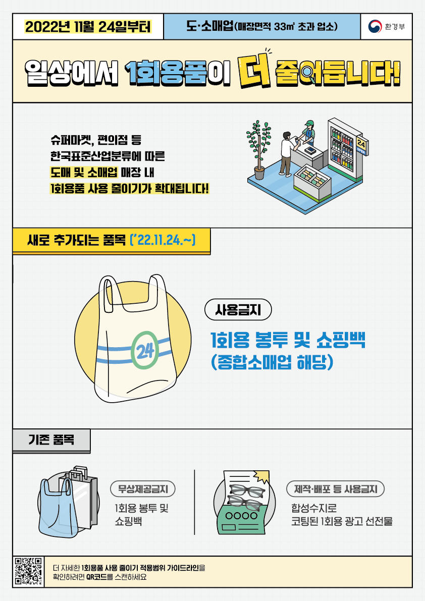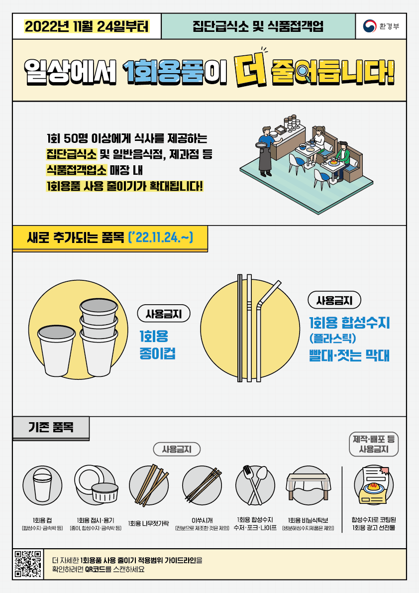 ○ 규제내용: 2022. 11. 24.부터 1회용품 사용규제 품목 추가 및 강화