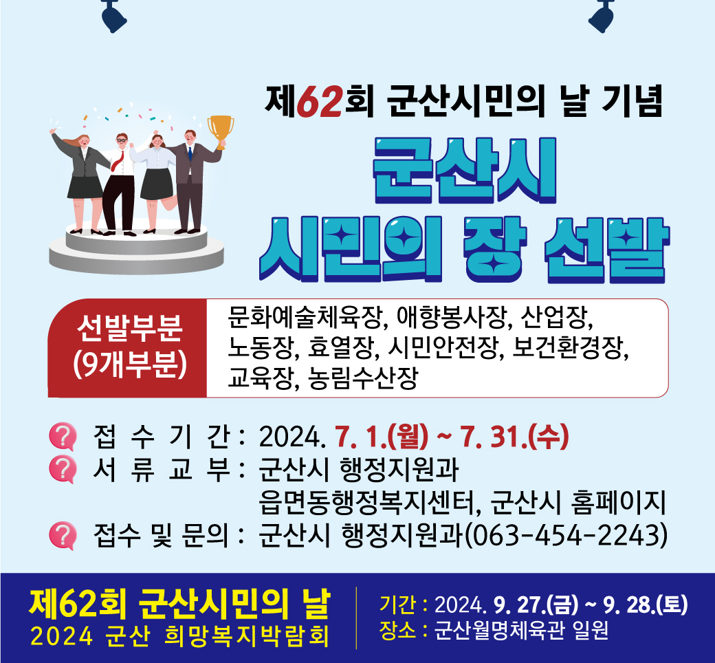 * 제62회 군산시민의 날 기념행사 : 2024. 9. 27.(금) ~ 9. 28.(토) / 군산월명체육관 일원