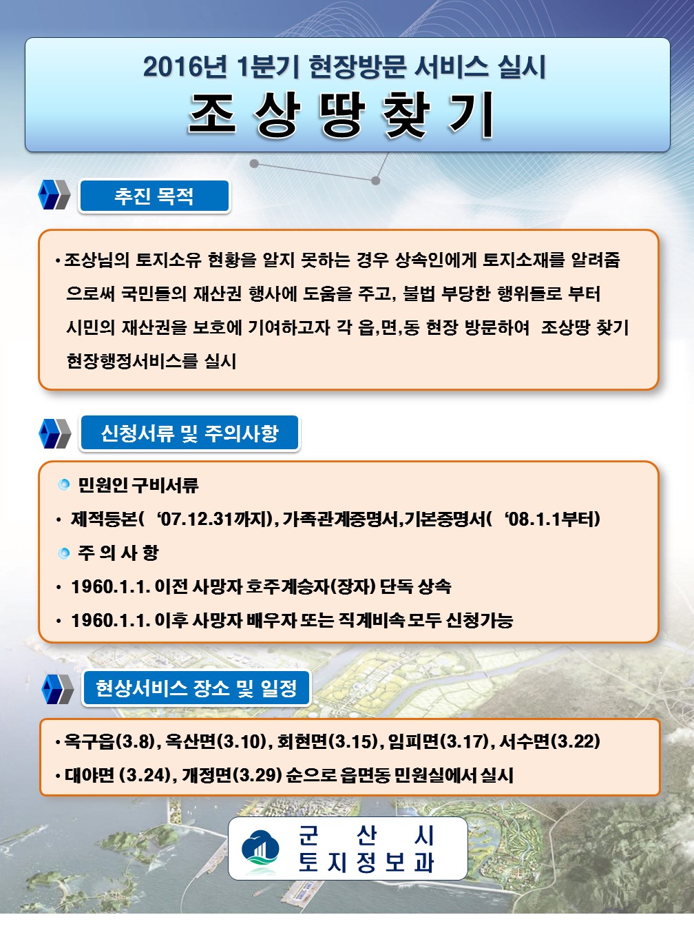 조상님의 토지소유현황을 알지 못하는 경우 상속인에게 토지소재를 알려줌으로써 국민들의 재산권행사에 도움을 주고 불법 부당한 행위들로 부터 시민의 재산권을 보호에 기여하고자 각 읍,면,동 현장방문하여 조상땅 찾기 현장행정 서비스를 실시