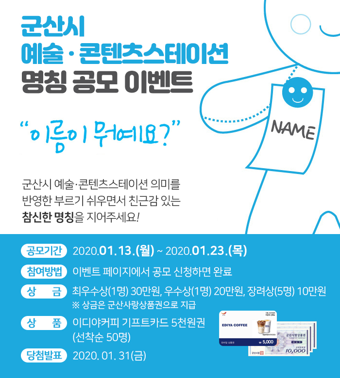 공모내용 : 군산시 예술·콘텐츠스테이션 의미를 반영한 부르기 쉽고 친근감 있는 참신한 명칭
