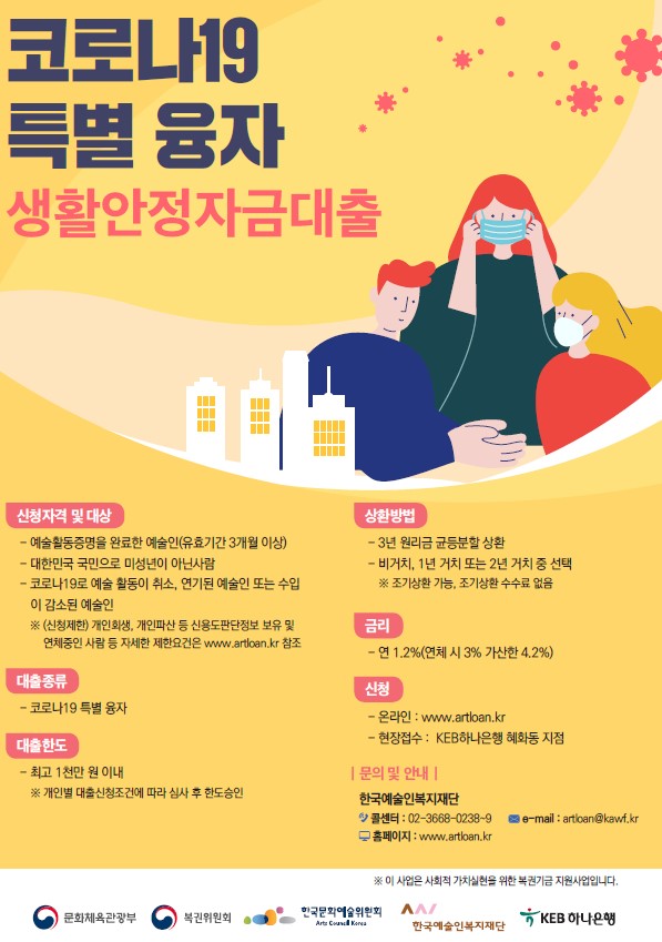 o 지원사업 : 예술인 창작준비금 지원(3.20마감), 코로나19특별융자, (소액)생활안정자금대출, 전세자금대출