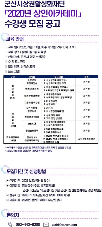 ■ 접수 및 문의 : 군산시상권활성화재단 경영지원팀(공설시장 3층) 방문접수 ☎ 063)443-8200