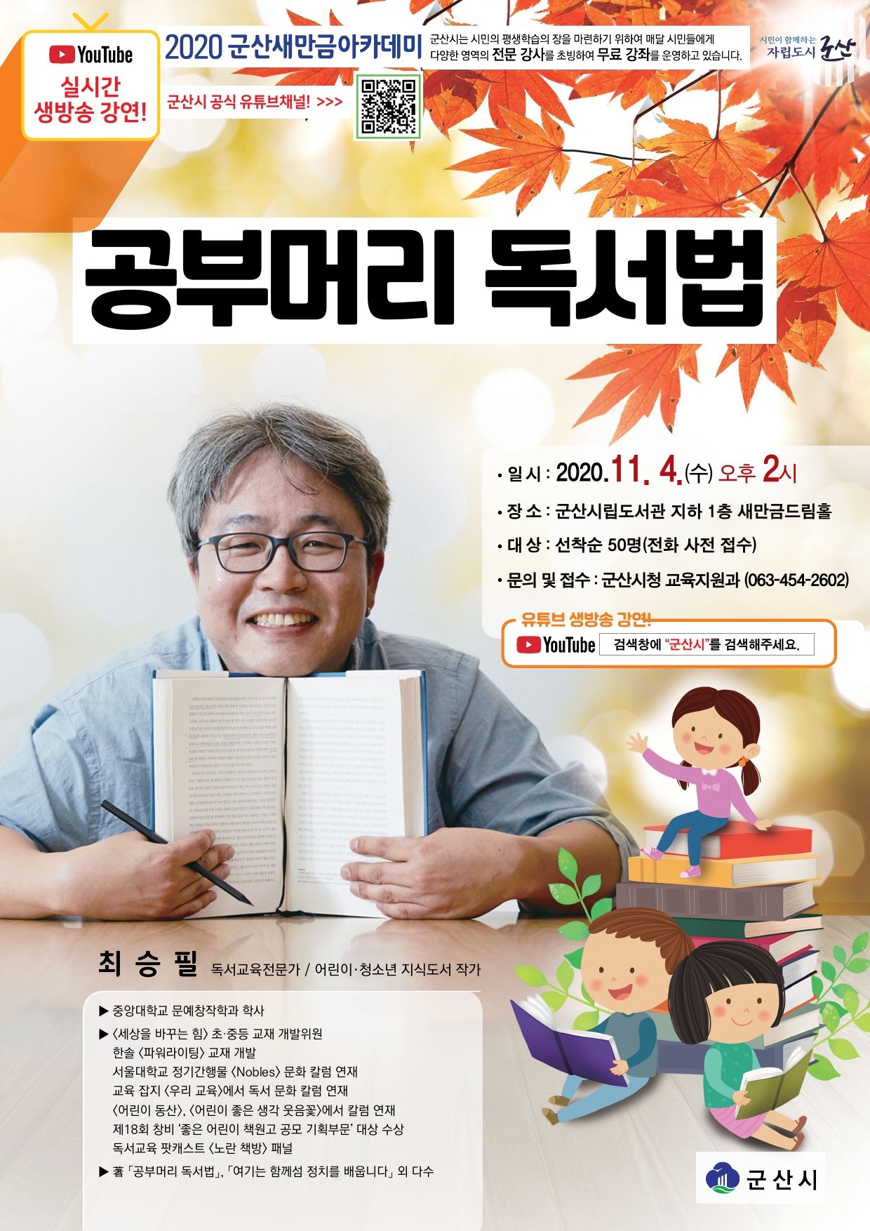 군산새만금아카데미에서는 최승필 작가를 초청하여<공부머리 독서법>이란 주제로 강좌를 다음과 같이 운영하오니 관심있는 시민여러분의 많은 참석 바랍니다.