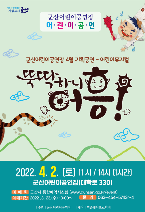 | 187 | 군산어린이공연장 4월 1차 기획공연 '뚝딱하니 어흥' 안내 |
