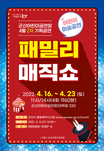 | 189 | 군산어린이공연장 4월 2차 기획공연 '패밀리 매직쇼' 안내 |