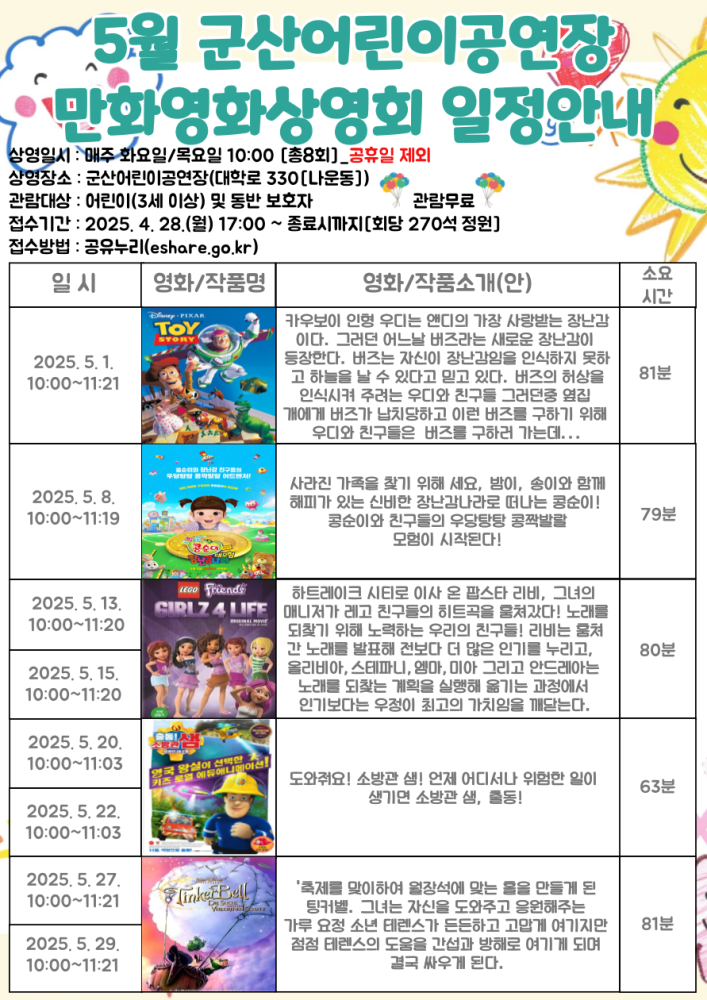 | 404 | 2025년 5월 군산어린이공연장 어린이 만화영화 상영 안내 |