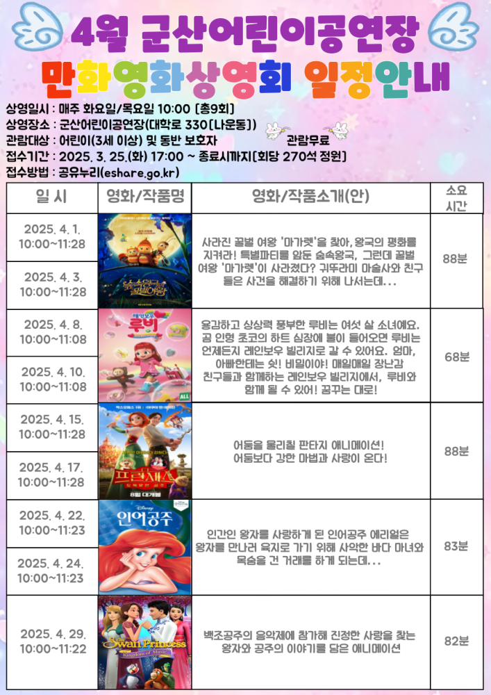 | 396 | 2025년 4월 군산어린이공연장 어린이 만화영화 상영 안내 |