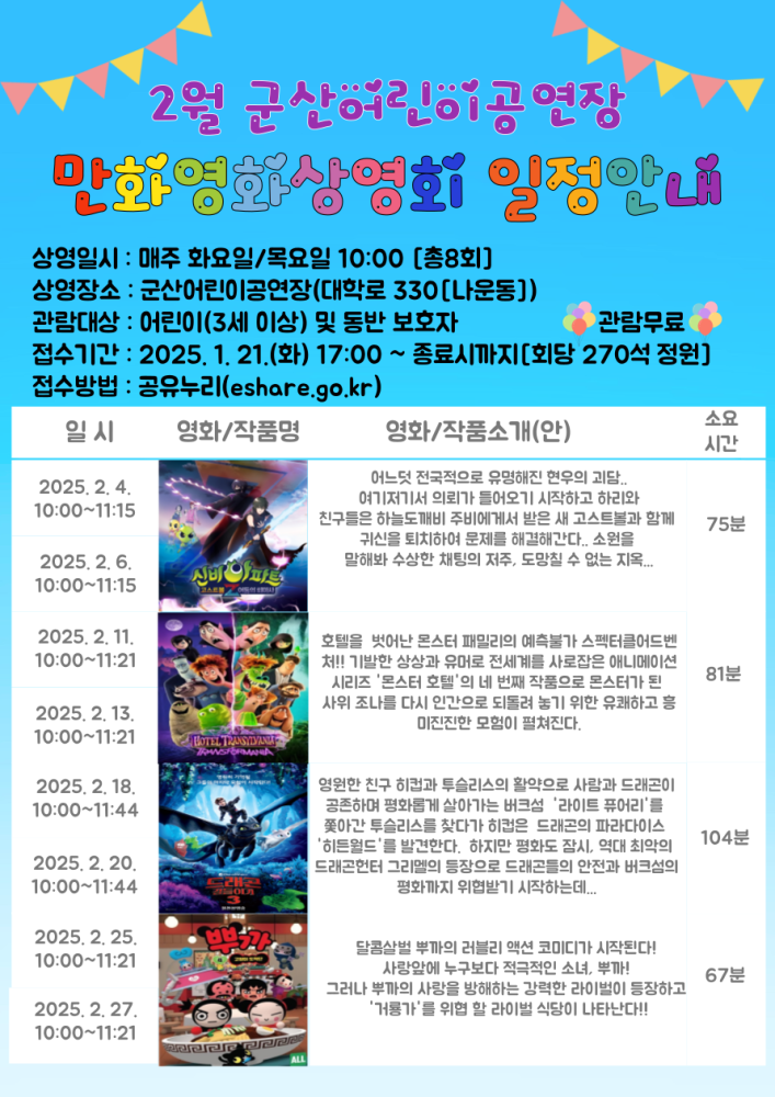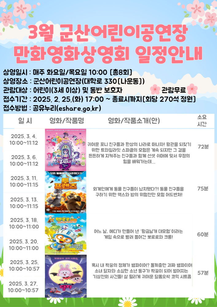 | 390 | 2025년 3월 군산어린이공연장 어린이 만화영화 상영 안내 |