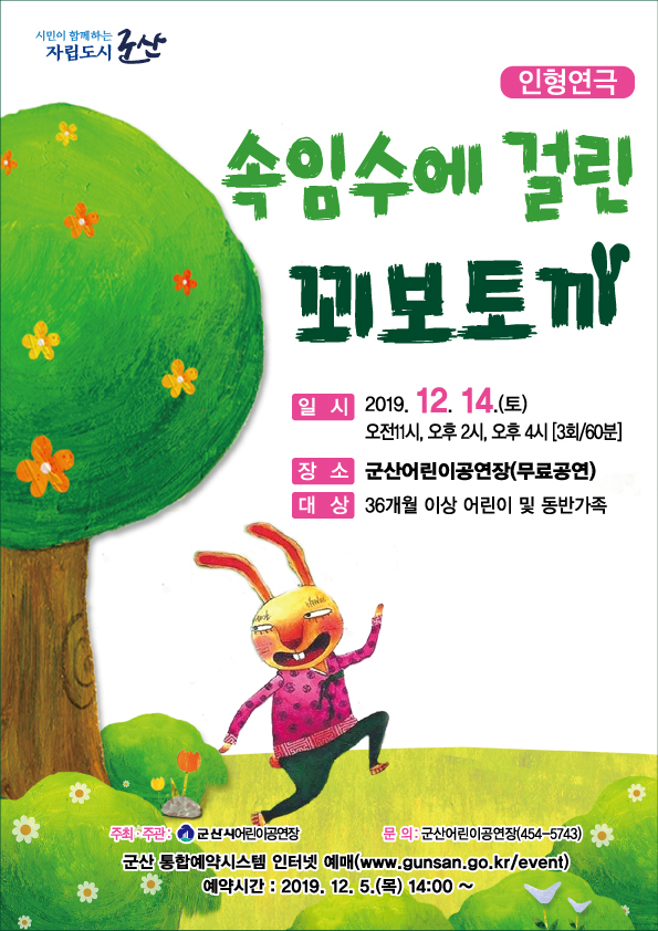 군산어린이공연장에서는 12월 14일(토요일) 11:00, 14:00, 16:00, 총 3회 군산시 어린이들을 위해 재미와 감동이 있는 인형극 "속임수에 걸린 꾀보토끼"를 무료 상연하오니 관심있는 시민들의 많은 관람 부탁드립니다.