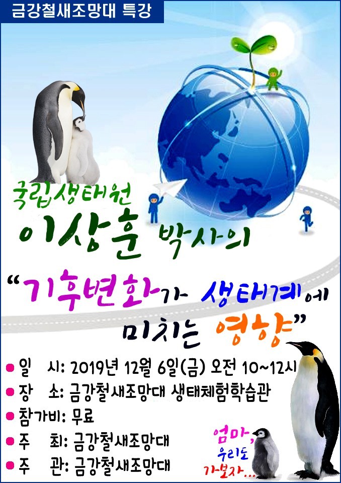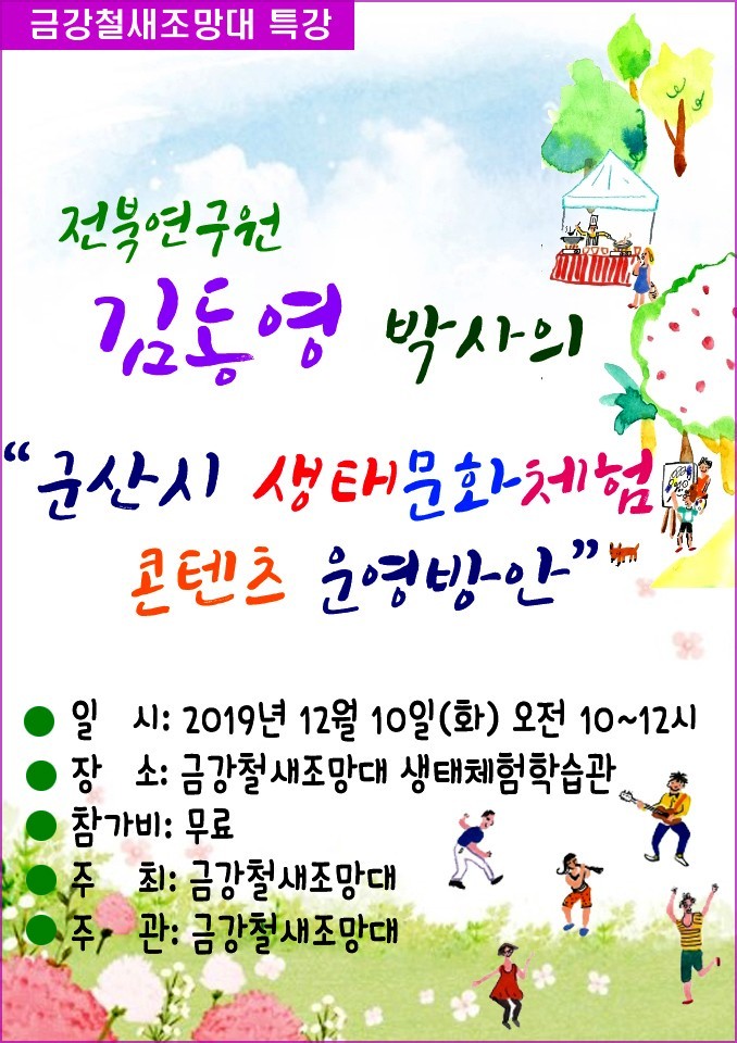 군산시 박물관관리과 금강철새조망대에서는 2019년 사계절체험프로그램의 일환으로시민들에게 생태환경에대한 인식 개선 및 전문적인 지식을 주기위한 생태 특강 및 세미나를 운영합니다.