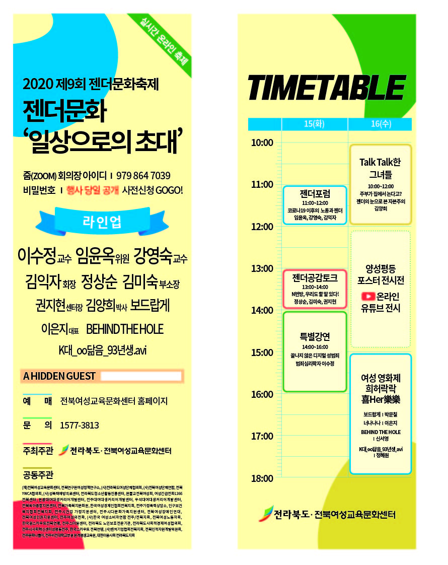 15:00~18:00 | ·여성영화제 보드랍게 외 주관 : (사)전북여성단체연합 | 실시간 온라인 방송 * 유튜브 스트리밍 (사전 신청자에 한 함) |