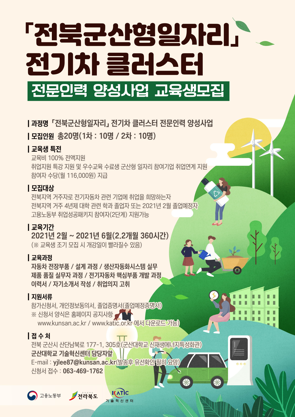 군산대학교에서 전북군산 상생형 지역일자리의 조기 안착 및 성공적인 추진하기 위해 「전북 군산형 일자리」전기차 클러스터 운영전문인력 양성 교육생을 아래와 같이 선착순 모집합니다.