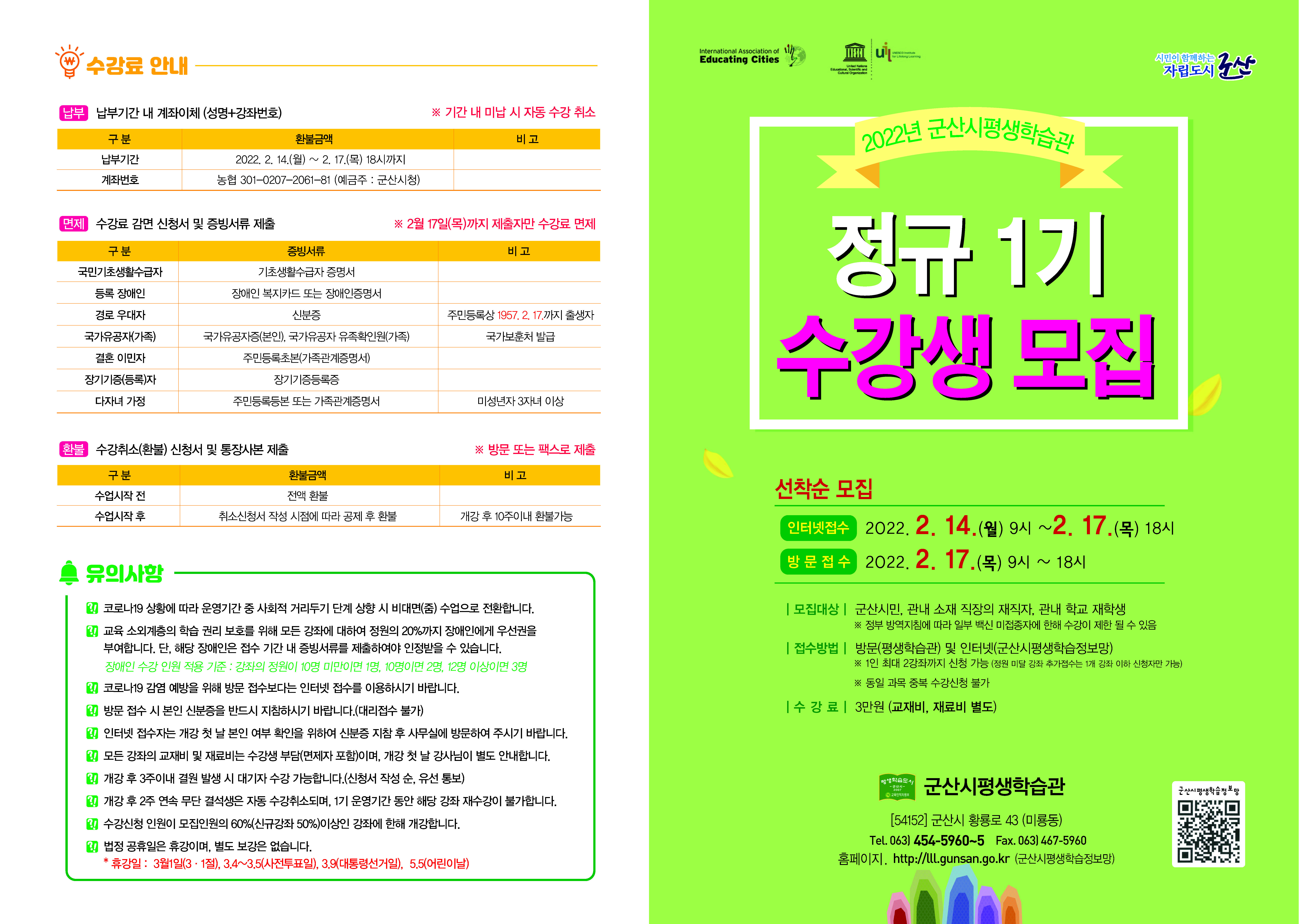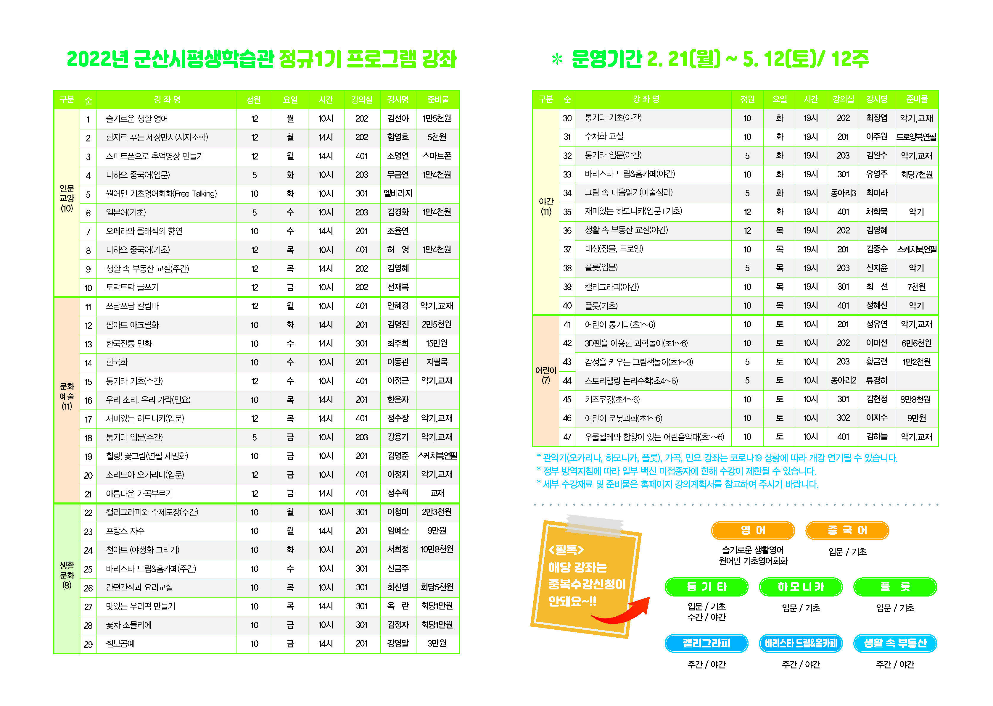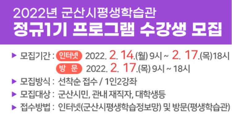 2022년 군산시평생학습관 정규1기 프로그램 수강생 모집