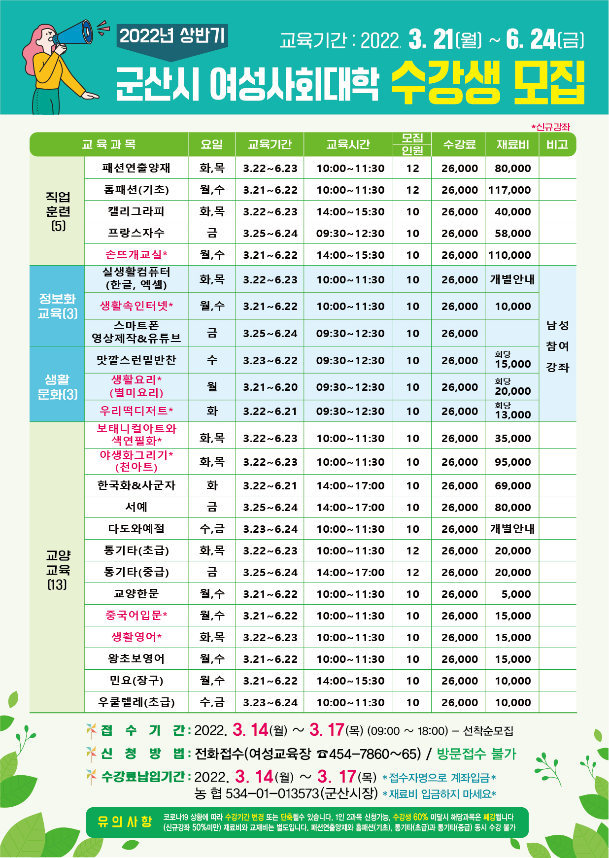 (단, 정보화교육(3강좌)/ 생활문화교육(3강좌)는 남성 참여 가능)