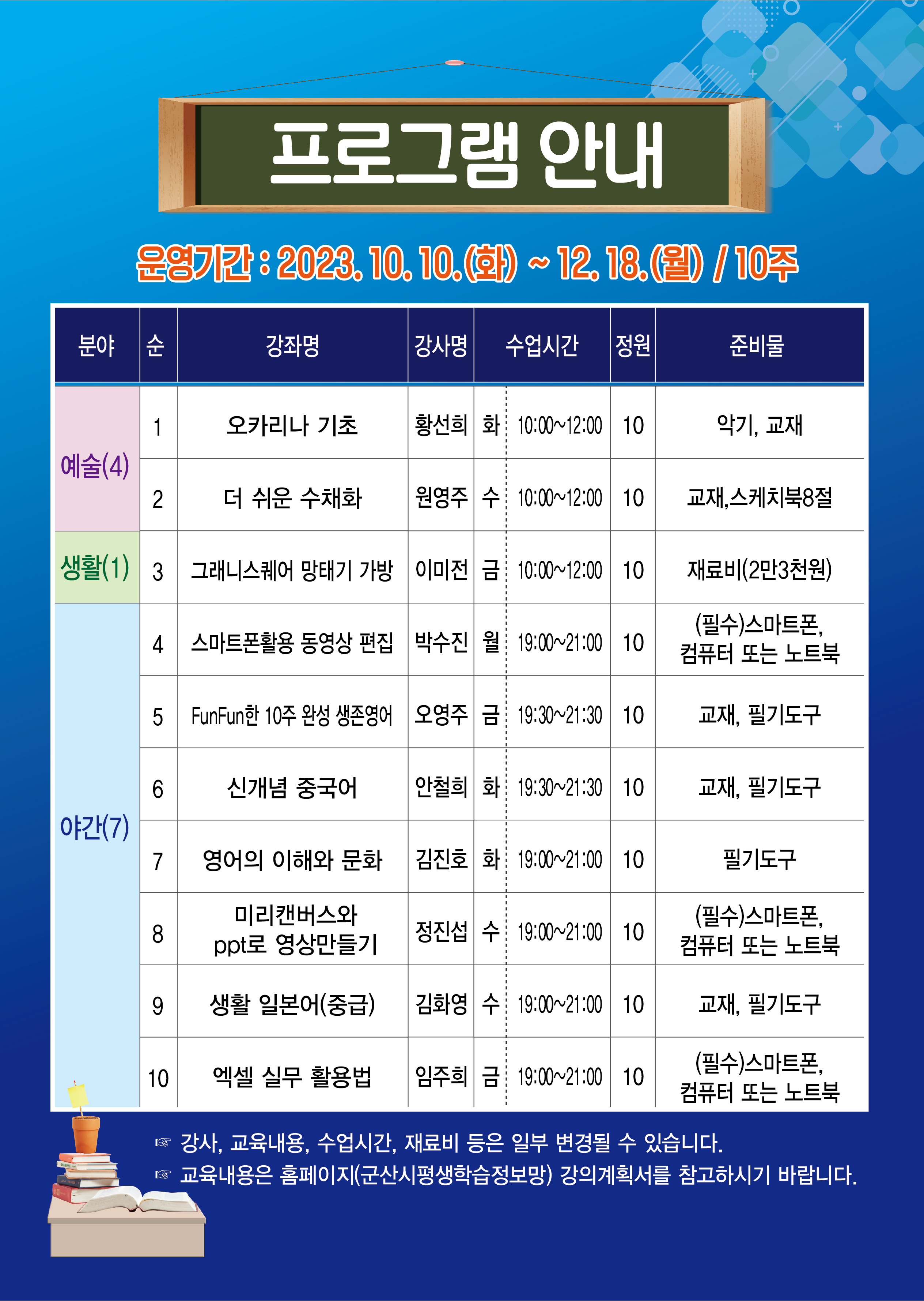 ○ 신청자격 : 군산시민, 관내 재직자, 대학생 등 (1인 2강좌 신청가능)