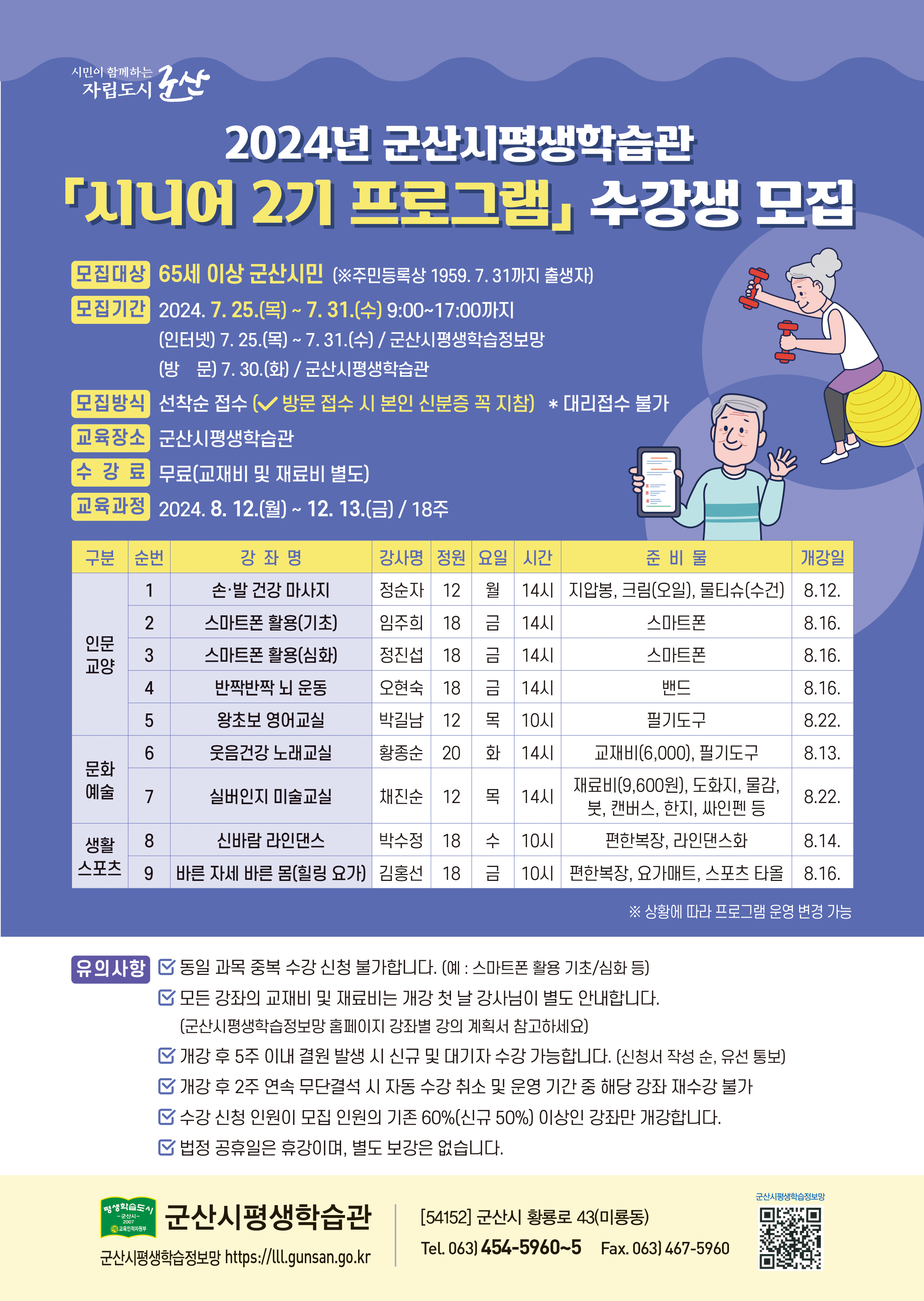 2024년 군산시평생학습관 시니어 2기 프로그램 수강생을 다음과 같이 모집합니다.