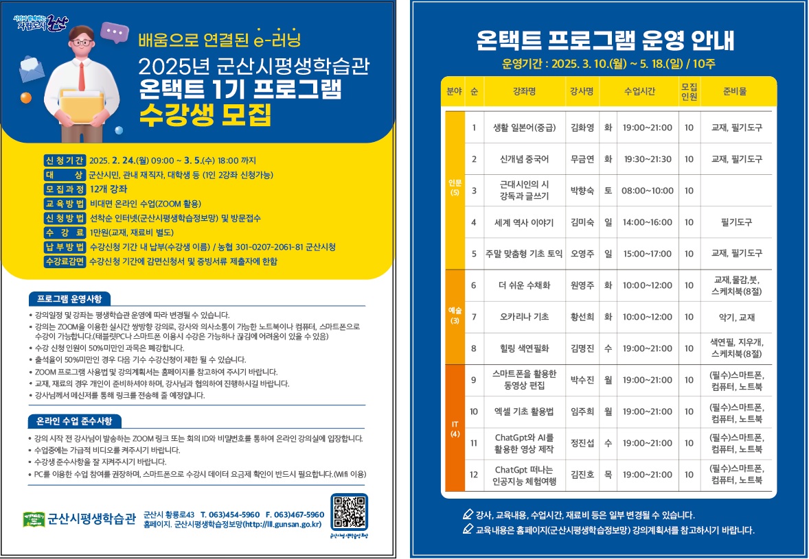 2025년 군산시평생학습관 온택트 1기 프로그램 수강생 모집