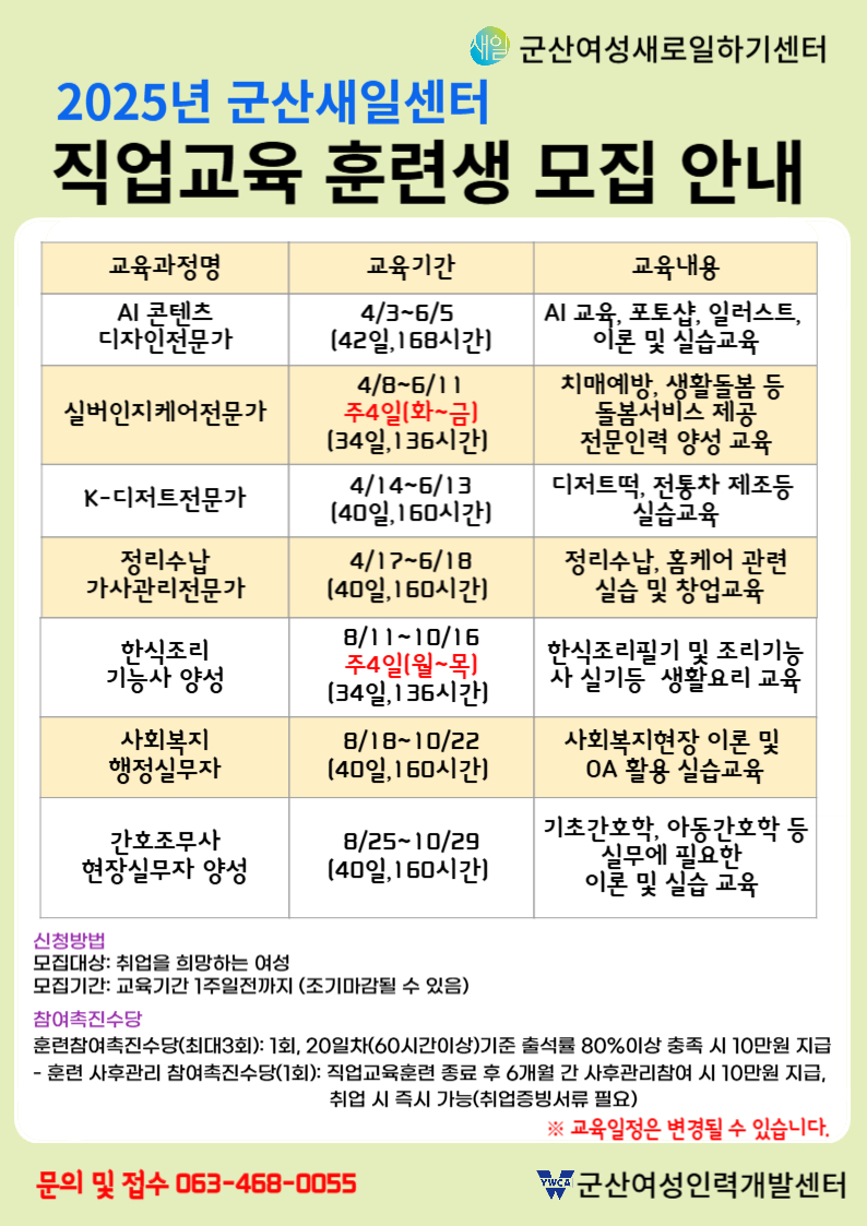 [군산여성새로일하기센터 2025년 새일센터 직업교육 훈련생 모집]