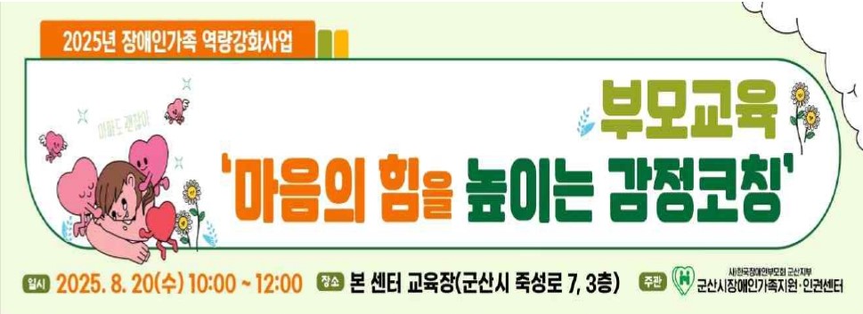군산시장애인가족지원·인권센터에서는 장애자녀를 둔 부모님을 대상으로 장애자녀가 표출하는 감정을 받아들이고 적절한 대처를 할 수 있도록 감정코칭 부모교육을 다음과 같이 실시하오니 많은 참여 바랍니다.