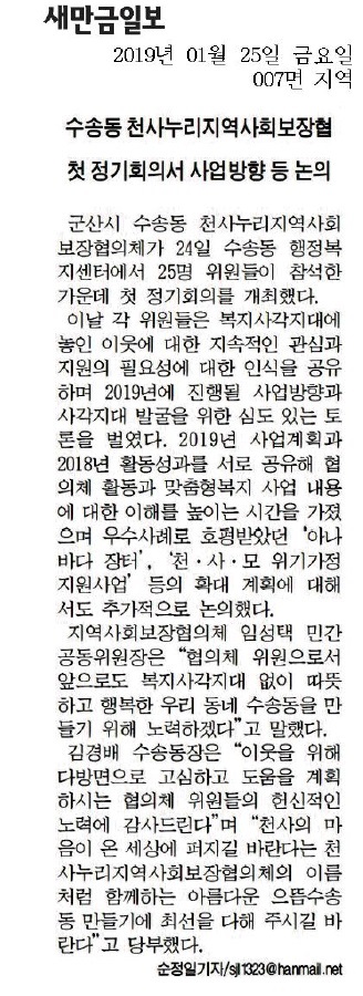 | 24 | 수송동 천사누리지역사회보장협의체 2019년도 첫 정기회의 개최 |