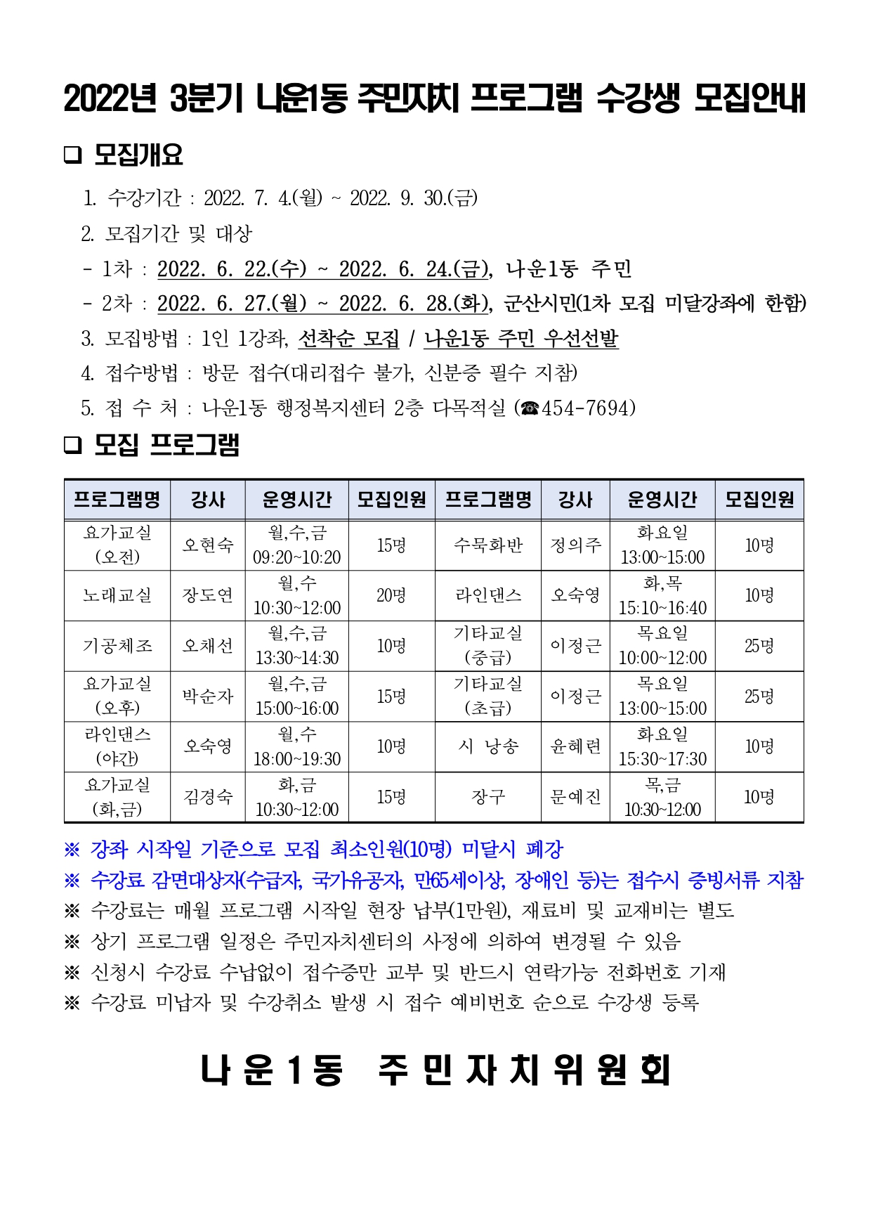 3. 모집방법 : 1인 1강좌, 선착순모집 / 나운1동 주민 우선선발