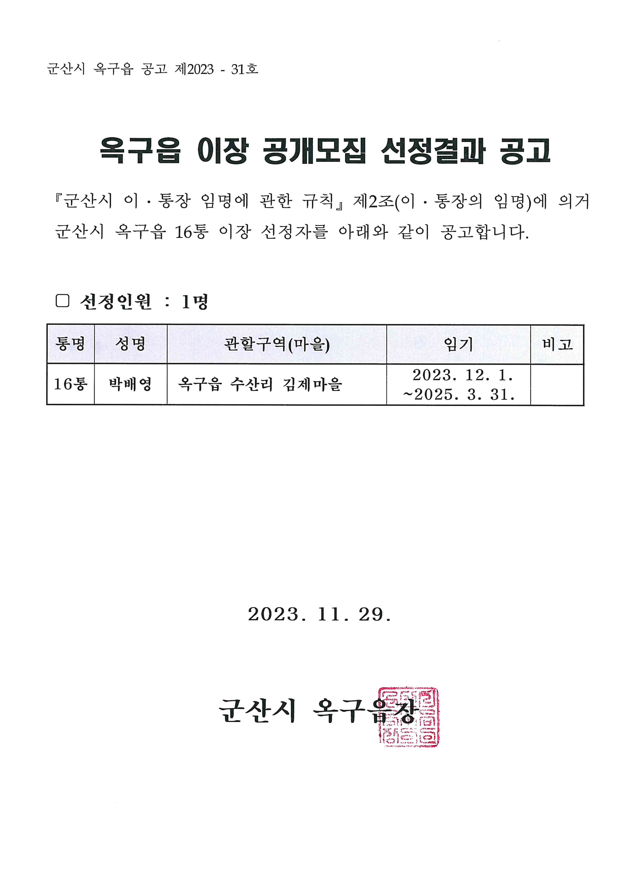군산시 이‧통장 임명에 관한 규칙 제2조(이‧통장의 임명)에 의거 군산시 옥구읍 16통 이장 선정자를 아래와 같이 공고합니다.