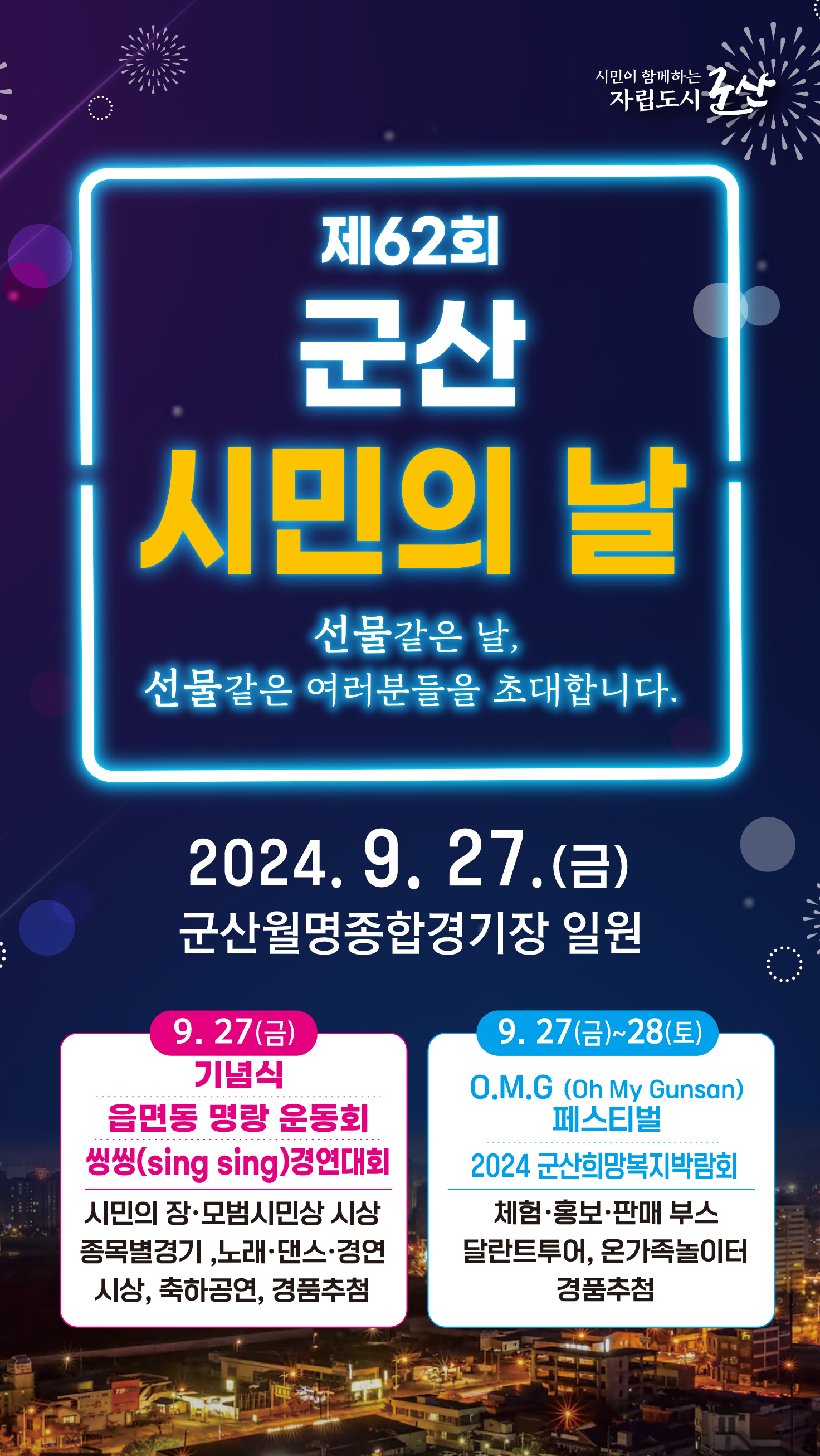 1. 『선물같은 날, 선물같은 여러분들을 초대합니다.』를 주제로, 전 시민이 함께 뛰고, 함께 웃고 참여하는 행사로 시민화합의 장을 마련하고자 오는 9월 27일(금)~9월 28일(토) 2일간, 군산월명종합경기장 일원에서 제62회 군산시민의 날 기념행사가 개최될 예정입니다.
