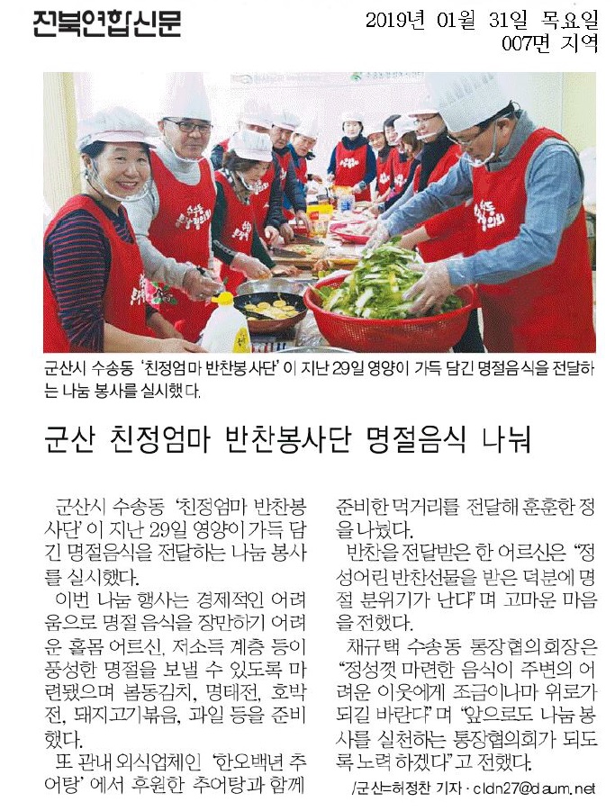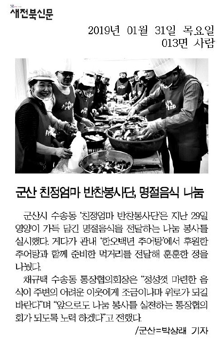 군산시 수송동(동장 김경배) 『친정엄마 반찬봉사단』에서는 29일, 지역 내 홀몸 어르신과 저소득계층 총 10세대에 손수 만든 명절음식을 전달하는 나눔 봉사를 실시하였다.