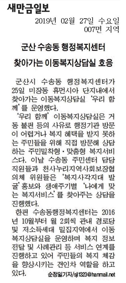 군산시 수송동행정복지센터(동장 김경배)에서는 지난 25일 미장동 휴먼시아 단지 내에서 찾아가는 이동복지상담실 “우리 함께”를 운영하였다.