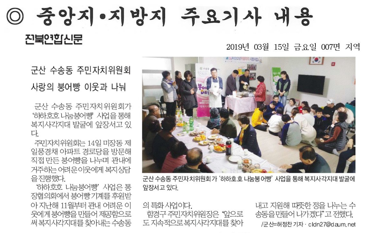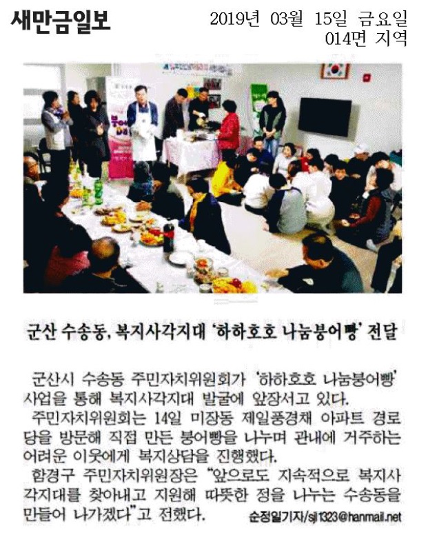 군산시 수송동 주민자치위원회(위원장 함경구)에서는 14일, 미장동 제일풍경채 아파트 경로당을 방문하여 “하하호호 나눔붕어빵”사업을 진행하며 지역 곳곳에 드러나지 않은 어려운 이웃을 찾아 나섰다.