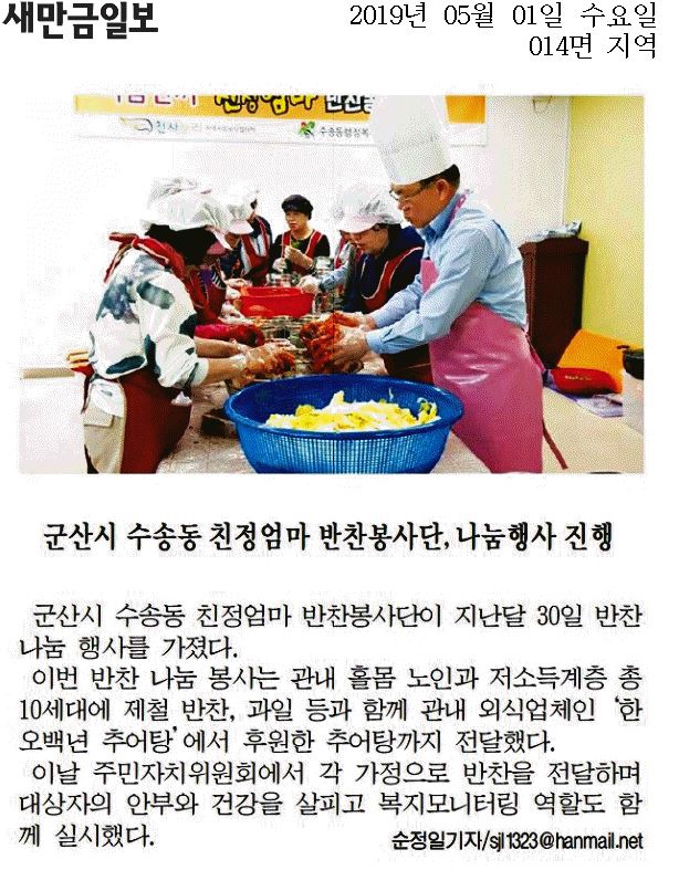 군산시 수송동(동장 김경배) 친정엄마 반찬봉사단에서는 30, 지역 내 홀몸 어르신과 저소득계층 총 10세대에 손수 만든 반찬을 전달하는 나눔 봉사로 이웃사랑을 몸소 추진하였다.