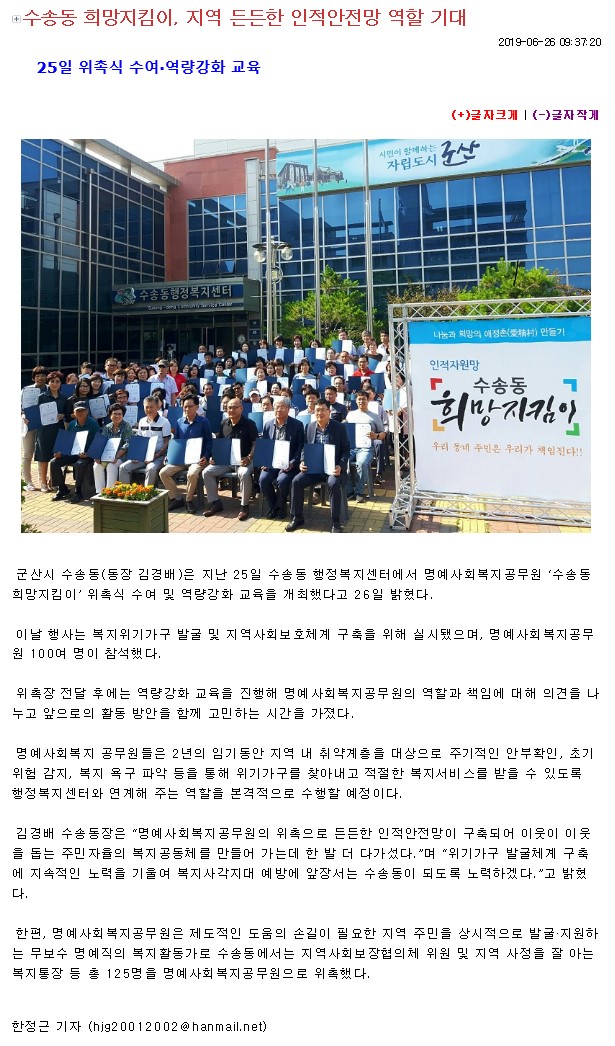 군산시 수송동(동장 김경배)에서는 25일 수송동 행정복지센터에서 인적자원망 “수송동 희망지킴이” 위촉식 수여 및 역량강화 교육을 실시하였다.