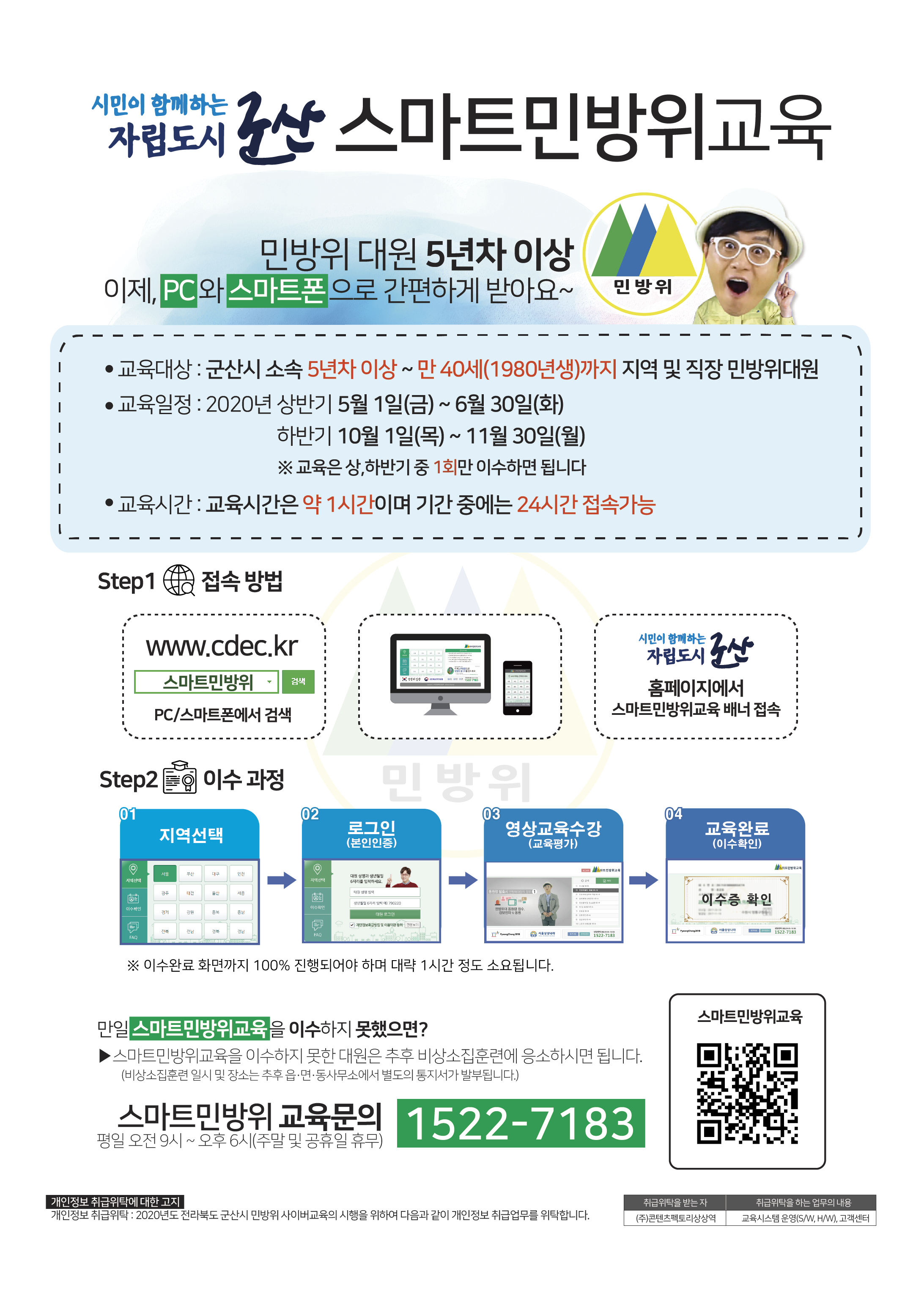 □ 문의방법 : 스마트민방위 교육문의 1522-7183(평일 오전 9시~오후 6시/주말 및 공휴일 휴무)