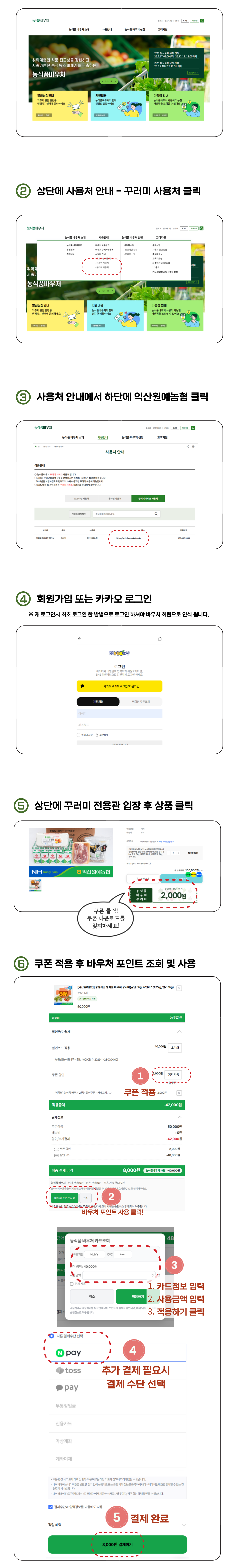 - 농식품바우처 홈페이지 접속·로그인 후 “사용안내 -> 사용처 안내 -> 꾸러미 사용처” 메뉴를 통해 꾸러미 주문 가능 (붙임 홍보물 참고)