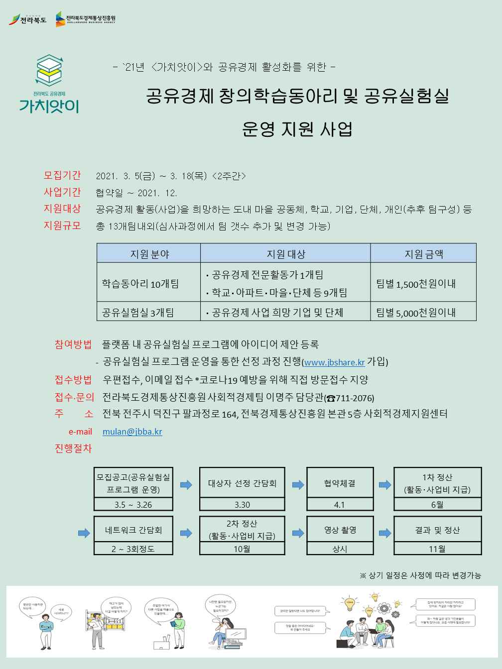 전라북도와 전라북도경제통상진흥원에서는 전라북도 공유경제 온라인플랫폼 ‘가치앗이’ 활용을 통한 공유경제 활성화를 위해 아래와 같이「공유경제 창의학습동아리 및 공유실험실」참가자(팀)를 모집합니다.