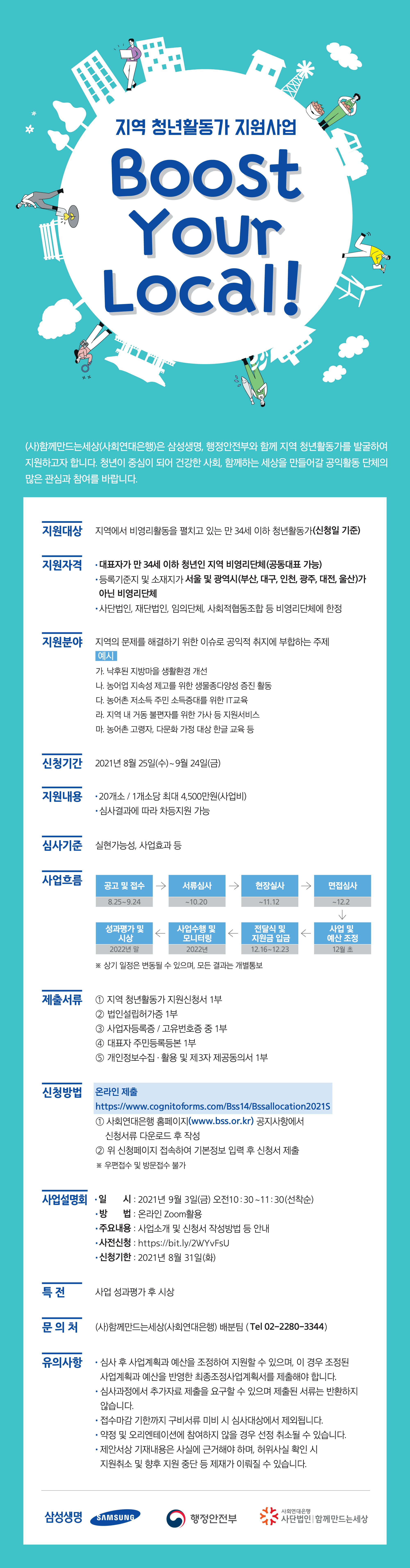 행정안전부에서 지역사회 문제해결과정을 통한 지역활성화 지원 생태계 조성을 위해 민관협력 「지역 청년활동가 지원사업」을 추진할 예정이니 관련 청년단체에서는 많은 참여바랍니다.