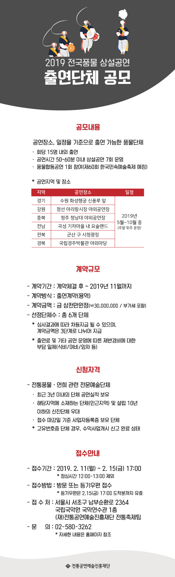 (재)전통공연예술진흥재단에서 2019 전국풍물상설공연의 출연단체를 공모합니다