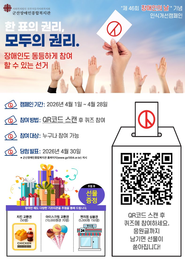 군산장애인종합복지관에서는 "한 표의 권리, 모두의 권리."- 장애인참정권을 주제로 하는 장애인인식개선 캠페인을 진행합니다.