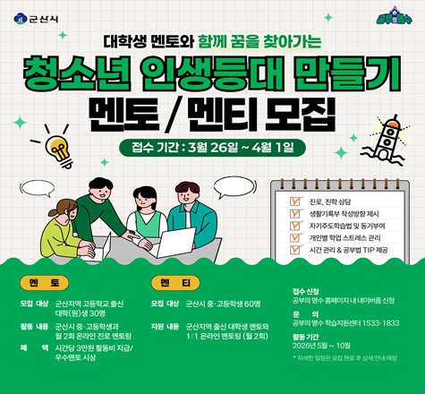 군산시로부터 수탁을 받아 운영 중인 『군산시청소년문화의집』에서 함께 일할 직원을 다음과 같이 공개모집 하오니 관심 있는 분들의 많은 지원 바랍니다. 1. 모집인원: 1명(방과후아카데미 팀장)2. 모집기간: 2026. 3. 27.(금)