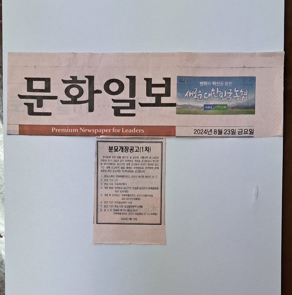 | 277 | 분묘개장공고(2차)-군산시 개정동 | 가나묘지이장공사 | 24.08.22 | 953 |