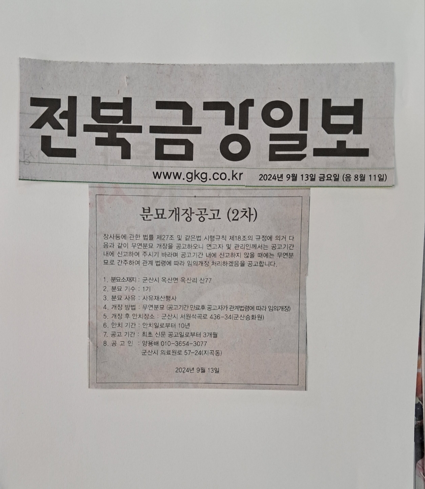 | 279 | 분묘개장공고2차:공고인 (양용배)군산시옥산면옥산리산77 |