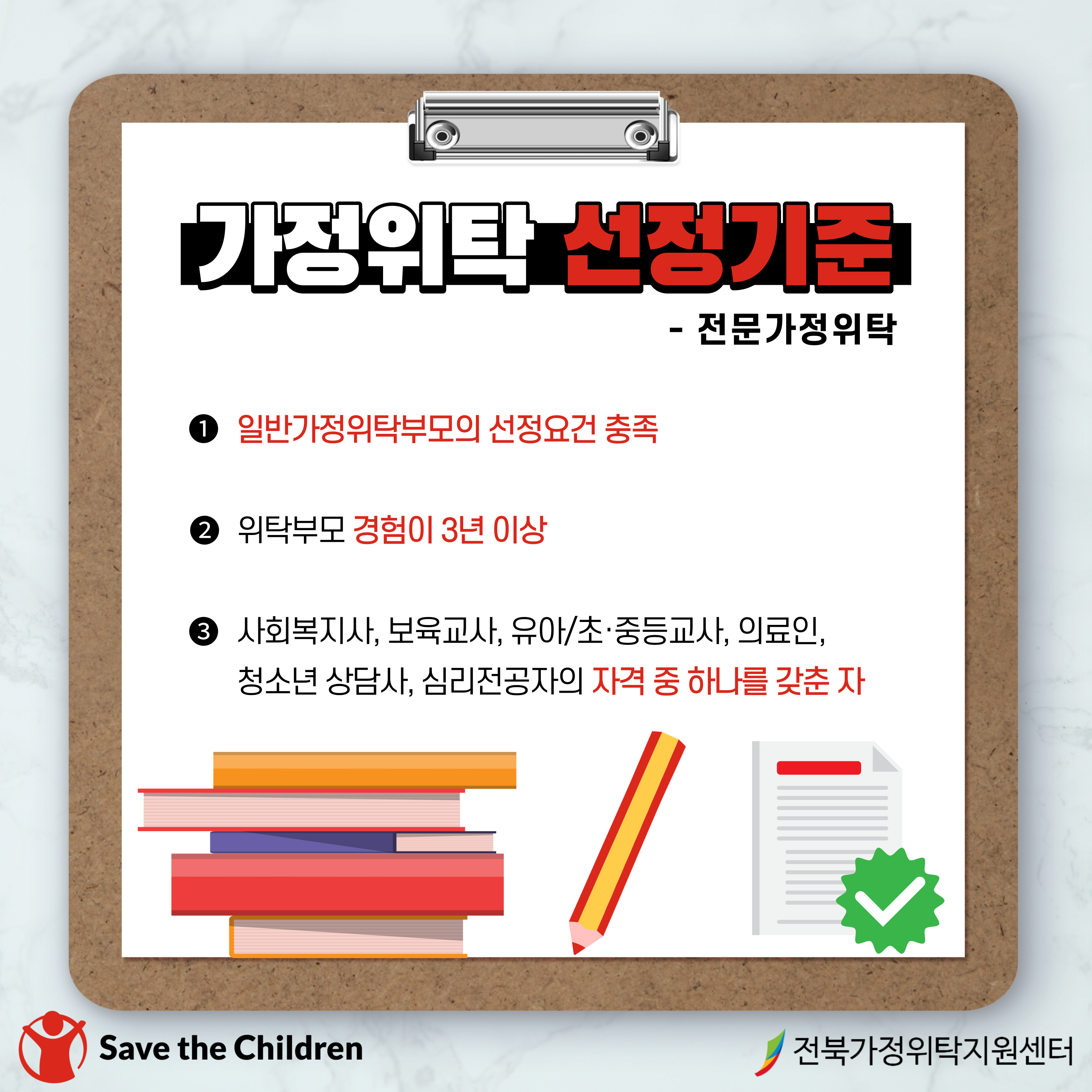 ❍ 전문위탁가정 자격요건 : 일반위탁가정 기준 이외에 ①교육 20시간을 이수하고, ②가정위탁보호자 경험(비혈연) 3년 이상 또는 사회복지사.교사.의료인.상담사.심리관련 전공자 등의 자격을 갖추어야 함