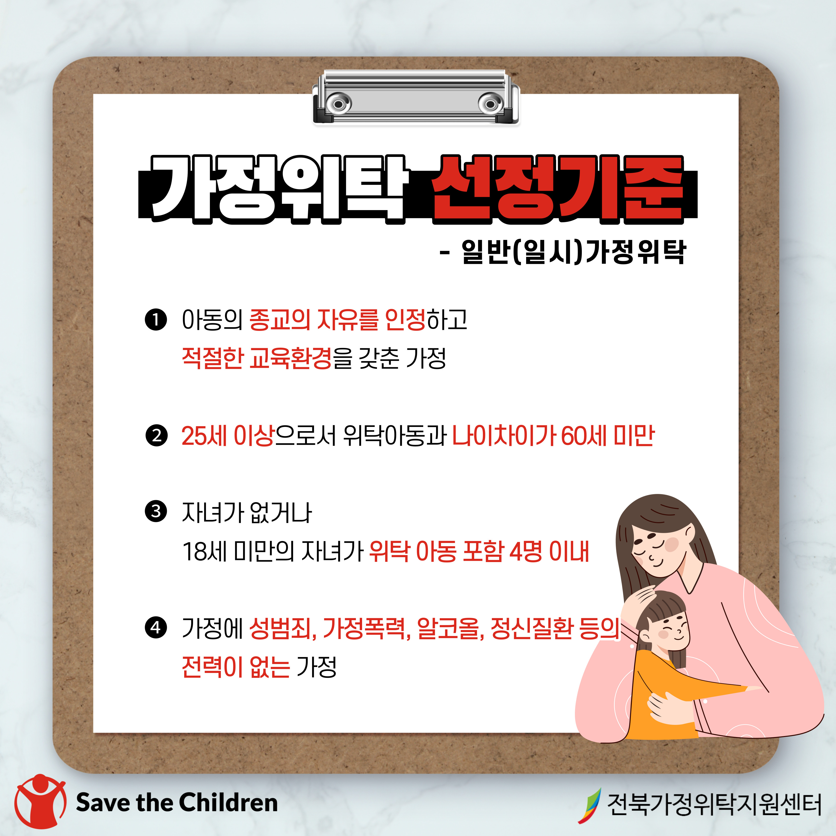 - 위탁부모 및 위탁가정에 거주하는 사람 중 성범죄, 가정폭력, 아동학대, 마약, 알코올, 약물 중독, 정신 질환 등의 전력이 있는 사람이 없을 것