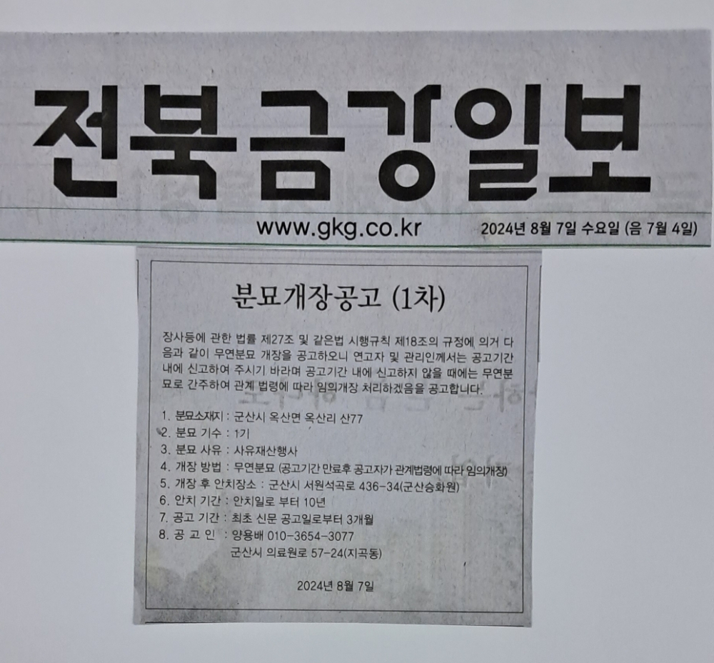 | 275 | 분묘개장공고(1차)-군산시 개정동 | 가나묘지이장공사 | 24.07.11 | 933 | |